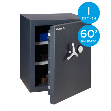 · Espesor de las paredes: 50mm · 3 tipos de sistemas de cierre a elegir: cerradura de llave de doble pala, combinación electrónica o llave + electrónica (a partir de tamaño 60). Todas ellas certificadas según norma EN 1300.